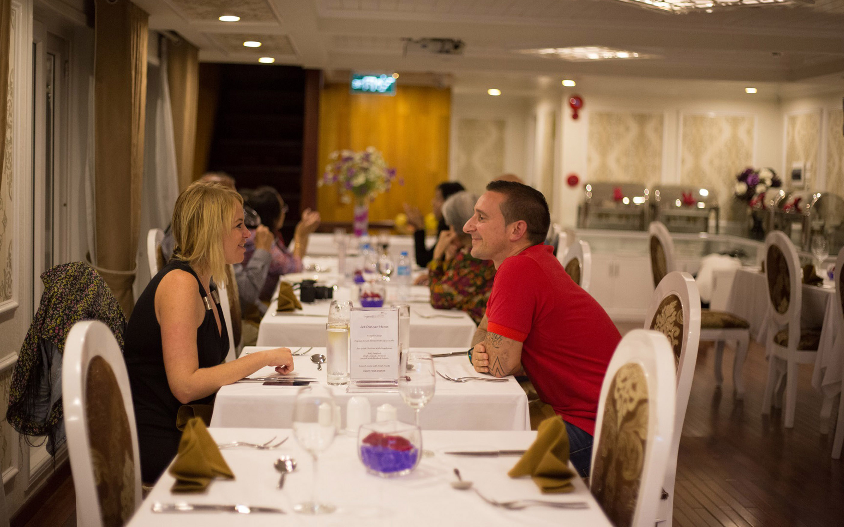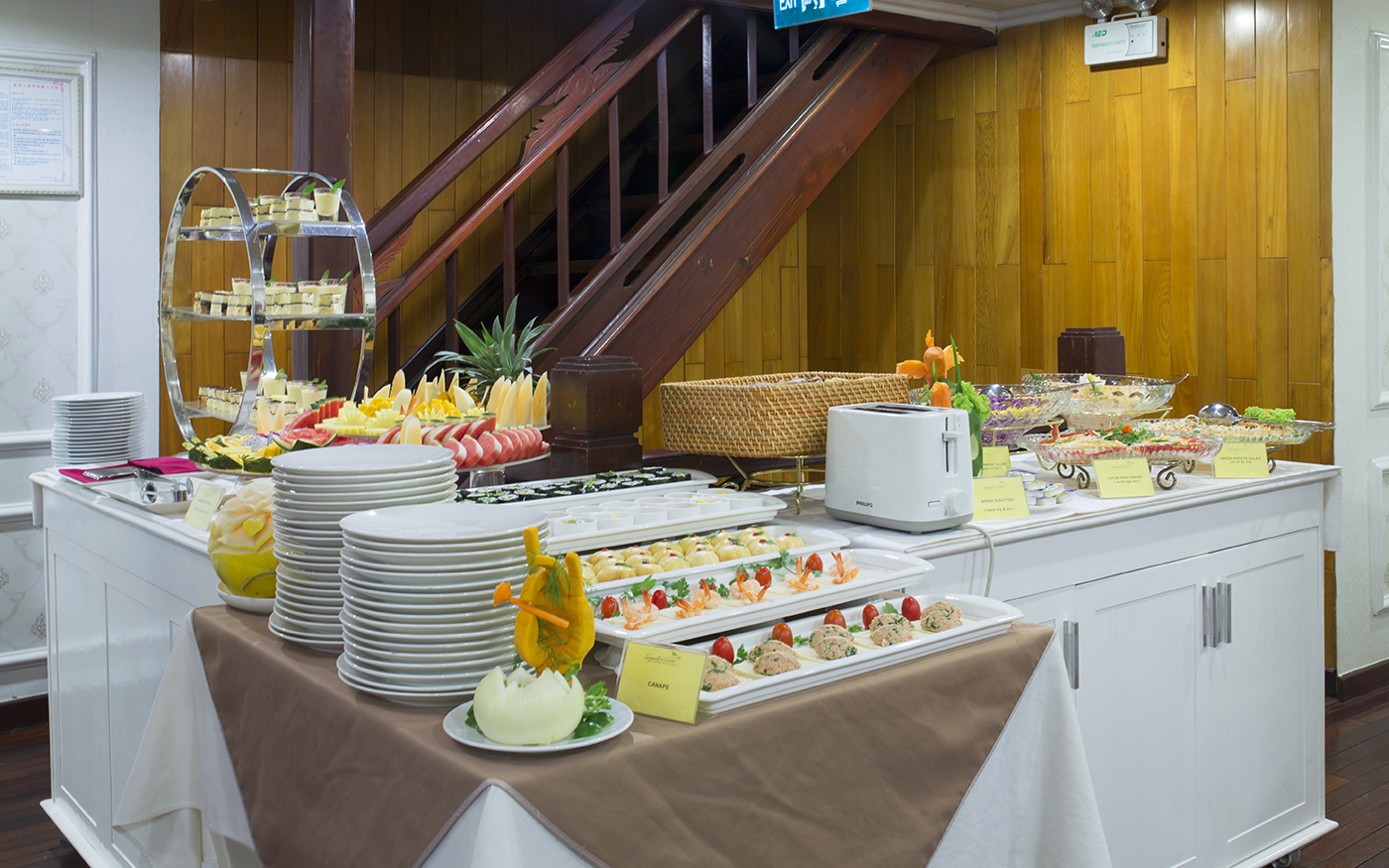 ✓ Du thuyền có khu vực Nhà Hàng theo tiêu chuẩn quốc tế cung cấp cho thực khách các món ăn theo phong cách Châu Âu và Việt Nam.